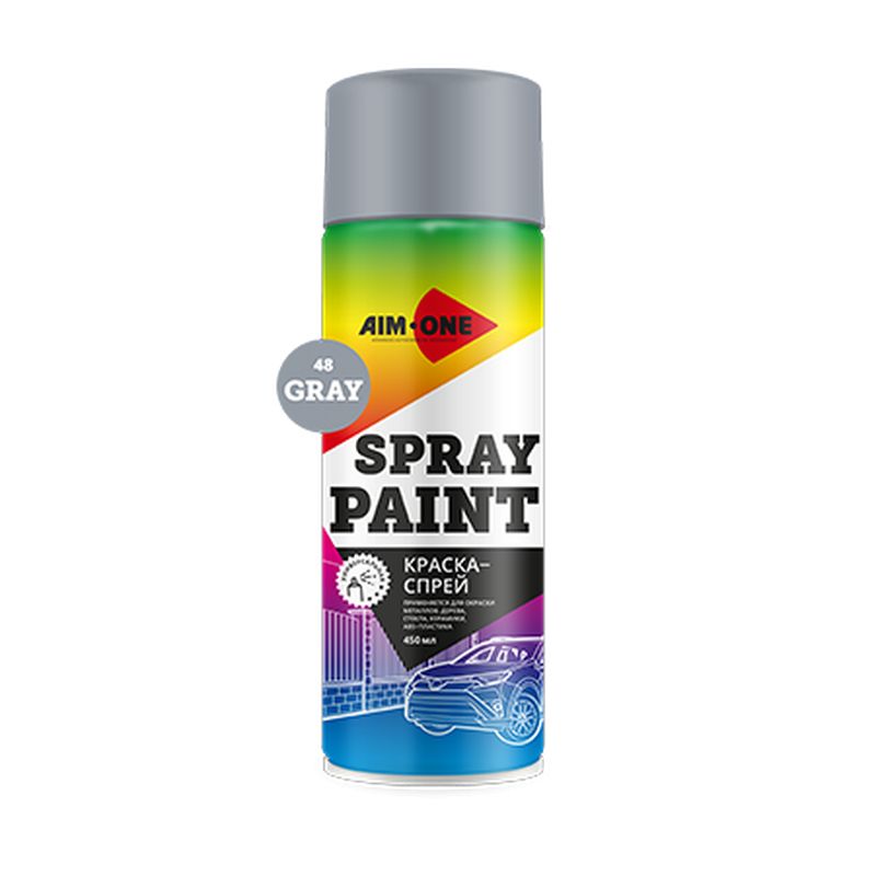 Spray paint gray — акриловая серая краска, предназначенная для финишного окрашивания металлических, стеклянных, деревянных, керамических поверхностей, а также ABS-пластика. Продукт может использоваться в процессе ремонта автомобиля, в быту и других сферах. Спрей предлагается в удобном баллоне объемом 450 мл с качественным распылителем.